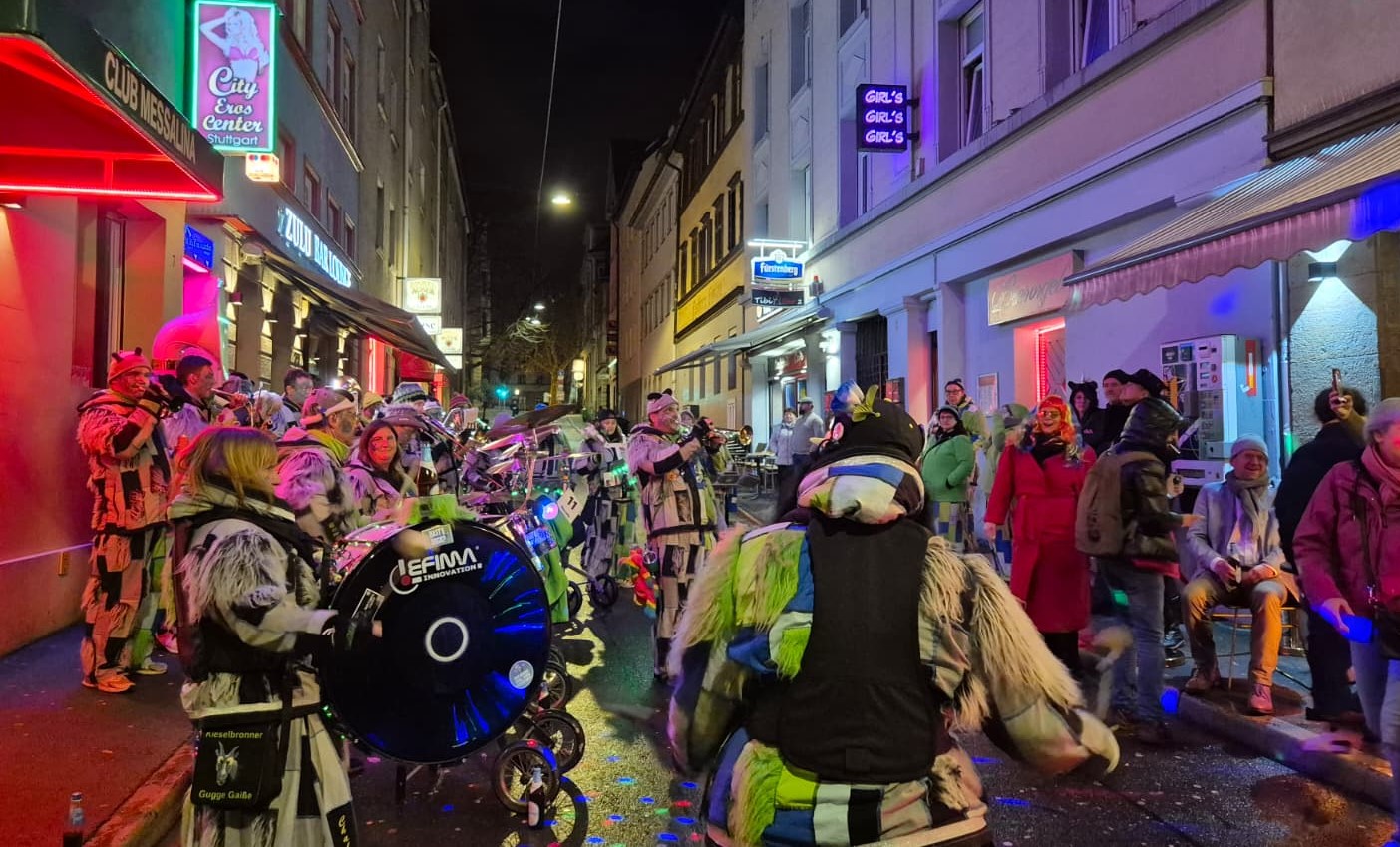 Nach unserem ersten Auftritt erwartete uns noch eine viel größere Überraschung: Unsere Stadtführerin Katharina führte uns weiter zur Altstadt – und zwar direkt ins Leonhardsviertel, ein Fleckchen Stuttgart, das uns unschuldigen Guggen bislang eher unbekannt war. Dort legten wir vor den einschlägigen Lokalen zwei weitere Auftritte hin und wurden vom anwesenden Publikum mit großem Beifall belohnt. Die Betreiber der dortigen Gastronomie versorgten uns großzügig mit Getränken und Snacks, alles hervorragend dargeboten und von uns mit ebenso viel Applaus gewürdigt. Die Stimmung im Viertel war ausgelassen, herzlich und voller guter Laune. Zwischen Musik, Gelächter, diversen Gras-Gerüchen und neugierigen Blicken mischte sich schnell das Gefühl, hier genau richtig zu sein. Unser Spiel hallte durch die schummrigen Gassen, und die Reaktionen der Gäste zeigten deutlich, dass wir mit unserer Musik (z.b. Sweet Caroline, Alles aus Liebe, Schrei nach Liebe, Verdammt ich lieb Dich usw.) den Nerv des Abends getroffen hatten. Fehlte nur noch der Spider-Murphy-Hit „Skandal im ….“. So wurde aus einem unvorhersehbaren Altstadt-Tripp ein unerwartet stimmungsvoller Höhepunkt – ein Auftritt, der uns noch lange in Erinnerung bleiben wird und der einmal mehr bewies, wie vielseitig und überraschend eine Guggen‑Tour sein kann.